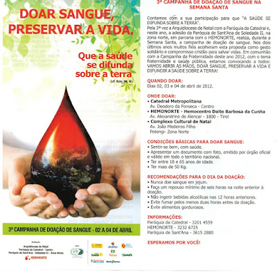 A 3ª Campanha de Doação de Sangue, promovida pela Arquidiocese de Natal, através da Paróquia da Catedral, e o Hemonorte, acontecerá no período de 2 a 4 de abril. Neste ano, houve a adesão, também, da Paróquia de Santana, no Soledade 2, zona norte de Natal. A abertura da Campanha, acontecerá na próxima segunda-feira, 2, às 9 horas, na Catedral, com a participação do Arcebispo, Dom Jaime Vieira Rocha.